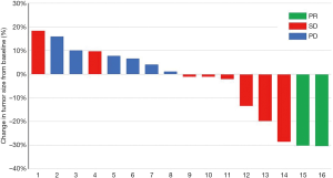 Tumor measurements were carried out monthly. There were no cases of complete response and two (10.5%) patients showed a partial response to treatment. Eight (42.1%) patients achieved stable disease, while six (31.6%) had progressive disease. Three patients could not be evaluated for disease status because they had no post-baseline efficacy assessment. The CBR was 52.6% (95% CI: 29.8–76.2%) at 3 months.