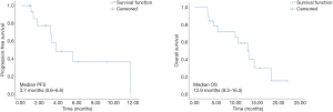 The primary endpoints were clinical benefit rate (CBR) and toxicity. CBR is defined as the percentage of patients achieving complete response, partial response, or stable disease according to the Response Evaluation Criteria In Solid Tumors (RECIST 1.1) criteria. Secondary endpoints included PFS and OS. The PFS was defined as time from the initiation of treatment to the date of disease progression or death from any causes, whichever came first; and OS was defined as time from the initiation of treatment to the time of death. We used Simon’s two-stage design, and analyzed the efficacy and toxicity in the intention-to-treat population (11). This study is registered with ClinicalTrials.gov, number NCT03213587.
