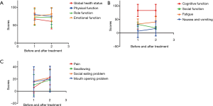 EORTC QOL-C30, European Organization for Research and Treatment of Cancer Quality of Life Questionnaire-Core 30; EORTC QOLH& N35, The EOTRC Quality of Life Questionnaire-Head and Neck 35. NA, none. *, The score in the functional area after treatment is the highest score after the treatment cycle, and the score in the symptom area is the lowest score after the treatment cycle.