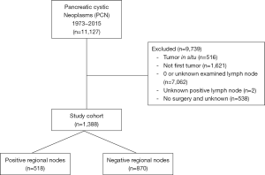 - Wu W, Hong X, Tian R, et al. An increased total resected lymph node count benefits survival following pancreas invasive intraductal papillary mucinous neoplasms resection: an analysis using the surveillance, epidemiology, and end result registry database. PLoS One 2014;9:e107962. [Crossref] [PubMed]
