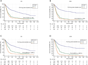Data from 1,246 patients who met the inclusion criteria were included in this study (Figure 1). The baseline patient characteristics and tumor features are summarized in Table 2. More than 60% of patients (n=767) had no regional lymph node involvement (N0) and 38% (n=479) had at least one positive lymph node. The median number of positive lymph nodes in LNR B and LNR C groups was one and four lymph nodes, respectively. There were no significant differences in the baseline characteristics of patients in groups LNR B and LNR C. A high LNR was associated with poor patient survival (median survival time, 13 vs. 21 months; P=0), lower RNE (median, 11 vs. 15 nodes; P=0), and a higher number of positive lymph nodes (median, 4 vs. 1 node; P=0). Since the characteristics of different invasive PCN types might vary, we also compared the patient characteristics and pathological findings, including lymph node status, for each PCN type (Table 3).