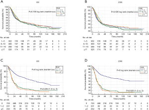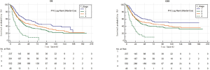Continuous variables were compared using the Student’s t-test, whereas categorical variables were compared using the Chi-square test. OS and CSS survival analyses were performed using the Kaplan-Meier method, and comparisons were performed using the log-rank test. Multivariate regression analysis was performed using the Cox proportional hazards model and a backward-elimination procedure with all possible confounders. Factors that demonstrated statistically significant (P<0.05) association with OS were included in the final analysis. All statistical analyses were performed using the SPSS software (version 20.0, SPSS Inc., Chicago, IL, USA). All P values are 2-sided; P values <0.05 were considered statistically significant.