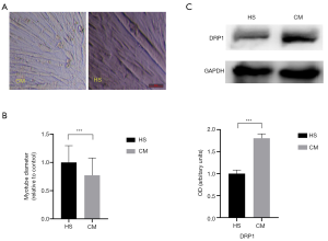 As C26-mediated atrophy has been widely used during cachexia in vitro research (20-22), we firstly assessed whether C26 CM could cause atrophy. The outcomes exhibited that culturing in C26 CM reduced the diameter of myotubes (Figure 1A). Specifically, the reduction of mean diameter was 23% compared with HS group (P=0.006) (Figure 1B). Meanwhile, an increase of DRP1 protein expression (P=0.0093) was observed (Figure 1C). In early differentiation stage of C2C12 myoblasts, an upregulated mitochondrial fission and DRP1 is accompany with an activated autophagy (usually D1). Afterwards, both autophagy and fission are suppressed (usually from D2 and on) (19,23). Therefore, the expression of DRP1 in myotube is not high. Our results indicated that C26 CM induced atrophy and DRP1 activation in C2C12 myotubes.