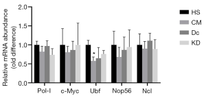 Ribosomes are organelles consisting of ribonucleoprotein complexes, which catalyze the synthesis of muscle protein directed by mRNA (24). Ribosome biogenesis could be affected under various catabolic conditions, including sarcopenia, disuse atrophy, and denervation (24). Additionally, a similar phenomenon was also observed in a mouse model of cachexia (25). However, studies have shown that knockout of S6K1 (the 70-kDa ribosomal protein S6 kinase (S6K), also called p70S6K), a major regulator of protein synthesis at the ribosomal level, activate mitochondrial fission and DRP1 expression in both mouse embryo fibroblasts and Henrietta Lack (HeLa) cells (26,27). Given the potential association between DRP1 and ribosomal biogenesis during muscle atrophy, as well as our transcriptome analysis, we examined the markers of ribosomal biogenesis at the mRNA level. The genes exhibited ribosomal DNA (rDNA)-related activity (Pol-I, c-Myc, and Ubf), ribosomal RNA (rRNA) processing (Nop56), and ribosome assembly (Ncl) (24). These outcomes indicated that the mRNA level of Ubf (P=0.0449) in CM group was reduced compared to that of the HS group, while DRP1 knockdown did not significantly abrogate this decrease (Figure 4). These results demonstrated a reduction in ribosomal activity during C26 CM-induced myotube atrophy.