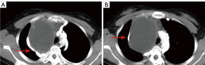 At present, even asymptomatic mature cystic teratoma of mediastinum, complete surgical resection is always recommended, and the main method used is the thoracoscopic resection of the tumor (1). In this case, there was a wide range of lesions, serious adhesion between the tumor and the surrounding tissue structure, and compression. Massive bleeding occurred many times during the surgery. We were of the view that if the tumor was removed completely, it might damage the surrounding blood vessels and nerves. Thus, many residual tissues remained after operation. However, a follow-up examination showed that the residual tissues had been basically absorbed, the surrounding tissues and blood vessels were basically restored, and there was no recurrence. Thus, in our view, this approach provided an applicable and effective way to retain some of the residual tissues, which were left for natural absorption. This avoided any trauma that would have been caused by the excessive separation of the tumor. Mature teratoma of mediastinum is a benign tumor. Generally speaking, the prognosis is better after complete surgical resection. In this case, due to the serious adhesion between the tumor and the surrounding tissues, if the tumor is completely removed, it may cause fatal bleeding. Considering this, we failed to achieve the goal of completely removing the tumor, but the patient did not see tumor recurrence after CT examination one year after operation, and the residual tissues were basically absorbed. This tells us that palliative resection of benign mediastinal tumors is also acceptable. It should be noted that huge mediastinal tumor compressed superior vena cava and azygos vein, which may lead to fatal respiratory failure or circulatory failure during anesthesia. Whether percutaneous drainage of tumor contents can be performed before operation is a question worth considering. However, it is worth noting that, firstly, we can’t determine whether the tumor is cystic or not and whether the contents can flow before the operation; secondly, the puncture risk is high where the tumor is located, so puncture drainage is not recommended; most importantly, if the tumor is malignant, puncture drainage may lead to tumor diffusion.