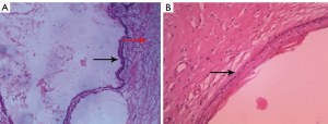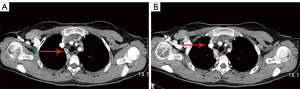 Mediastinal mature cystic teratoma, composed of differentiated and mature tissues, is a common type of mediastinal teratoma with slow onset and no symptoms in most patients (4,5). In a few patients, the tumor invades the tissue around the mediastinum, there is malignant transformation, and other symptoms may present, such as chest pain, chest tightness, and cough (4,5). If cystic teratoma of mediastinum involves the lungs, there will be recurrent pneumonia and atelectasis, and pericardial effusion may occur when pericardium is involved, invasion of bronchus may cause cough of tofu-like secretion (6). According to CT findings, most cystic teratomas are quasi-round or oval, and the cavity is rich in sebum-like fluid, showing fat density or uniform liquid density, with hair and cartilage components in the capsule (7). In this case, a chest CT scan of the patient showed a round watery density shadow in the right middle and upper mediastinum, and a few small nodular and punctate density that increased the shadow at the edge, which were consistent with corresponding manifestations. For MRI, the cystic teratoma showed fat and calcified or ossified elements in the tumor (8), it is a pity that this case was not MRI-examined and therefore could not be compared.