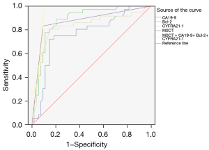 MSCT, multi-slice spiral computed tomography; AUC, areas under the curve; CA19-9, carbohydrate antigen 19-9; Bcl-2, B-cell leukemia/lymphoma-2 protein; CYFRA21-1, cytokeratin 19 fragment antigen 21-1.