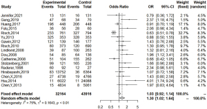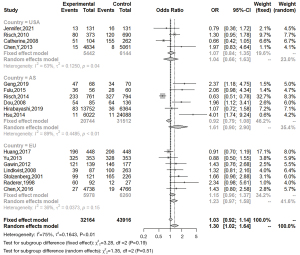 An overall meta-analysis and three subgroup-analysis were carried out for the included studies. Meta-analysis results showed that H. pylori infection was generally associated with the occurrence of pancreatic cancer (OR =1.30; 95% CI: 1.02–1.64; P=0.03) (Figure 2). Heterogeneity test results indicated that the included studies had significant heterogeneity (I2=75%; P<0.01), so the random effect model should be selected. Subgroup-analysis was carried out to explore the source of heterogeneity due to the significant heterogeneity between studies, which could improve the credibility of this study.