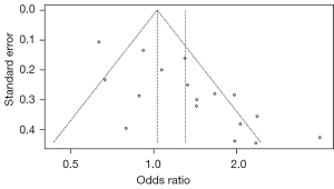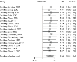 The living environment and habits of people in different regions were quite different, which could be the result of the significant heterogeneity in developed areas group. For this reason, we divided all the studies into three subgroups according to the continent the study came from. They were the Asian group, European group and North American group (Figure 5). The results of the subgroup-analysis showed that there existed heterogeneity in the North American group, and the difference was statistically significant (I2=63%; P=0.04). In this group, we did not observe the connection between H. pylori infection and pancreatic cancer (OR =1.04; 95% CI: 0.66–1.63). There was significant heterogeneity in the Asia group, and the difference was statistically significant (I2=89%; P<0.01). It didn’t show the relation between H. pylori infection and pancreatic cancer in the Asian group (OR =1.61; 95% CI: 0.90–2.90). The European group didn’t show significant heterogeneity (I2=36%; P=0.15). Similarly, this group indicated that H. pylori had nothing to do with pancreatic cancer (OR =1.15; 95% CI: 0.96–1.37). In a word, there was no association between H. pylori infection and the incidence of pancreatic cancer in the three regions, but the Asia group had significant heterogeneity (I2=89%), which might be the main source of overall heterogeneity. Therefore, this result was still not convincing due to the unexplained heterogeneity. Furthermore, after carrying out a sensitivity-analysis by the leave-one-out method, we found that Risch’s study was the main factor for the increase in heterogeneity (Figure 6). After being eliminated, the I2 statistic was reduced to 58%. The overall results did not change significantly, while partial results of subgroup-analysis changed. When we carried out a subgroup-analysis according to the type of study, the I2 statistic in the case-control group decreased to 22% (P=0.26), which indicated that there was no significant heterogeneity in the group. Case-control studies showed that H. pylori infection was related to pancreatic (OR =1.52; 95% CI: 1.24–1.88). When the subgroup-analysis is carried out according to the regional economic level, the result is stable. When the subgroup-analysis was carried out according to the continent, the results of the Asia group were reversed, which indicated that H. pylori infection could be significantly associated with pancreatic cancer in the Asian population (I2=63%; P=0.03; OR =1.95; 95% CI: 1.24–3.07).
