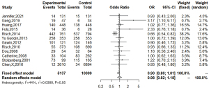 CagA antibody was detected in seven case-control studies, four nested case-control studies and 1 cohort study, with a total of 15,146 subjects. The result of the meta-analysis showed that there was no significant association between CagA-positive H. pylori infection and pancreatic cancer on the whole (I2=44%; OR =0.90; 95% CI: 0.80–1.01) (Figure 7).