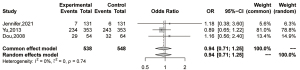 To further study the relationship between the subtype of H. pylori and pancreatic cancer, we explored whether VacA-positive H. pylori infection could promote the occurrence of pancreatic cancer. Two case-control studies and 1 nested case-control study were included, with a total of 1,086 subjects. We did not find the significant association between VacA-positive H. pylori infection and pancreatic cancer (I2=0%; OR =0.94; 95% CI: 0.71–1.25) (Figure 8).