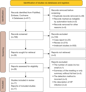 (I) The content of the study was about the relationship between H. pylori and pancreatic cancer. (II) The type of study was a case-control study or cohort study. (III) NOS (Newcastle-Ottawa Scale) score >3 points. (IV) The diagnostic method of pancreatic cancer and H. pylori (such as serological test, breath test and gastroscopic biopsy) must be illustrated and the diagnosis must be clear. (V) The odds ratios (OR) and 95% confidence interval (CI) should be given in the study directly or could be calculated from the original data.