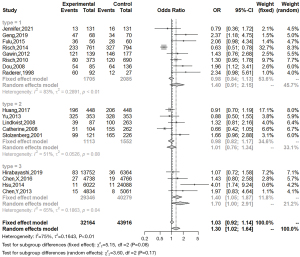 Considering that there were great differences in the research methods and quality of each type of study, we divided this study into three groups according to the type of study (Figure 3). They were case-control group, nested case-control group and cohort study group. The results of the subgroup-analysis showed that there was significant heterogeneity in the case-control group (I2=83%; P<0.01), and the difference was statistically significant. H. pylori infection was not associated with pancreatic cancer in the case-control group (OR =1.40; 95% CI: 0.91–2.15). The nested case-control group also had heterogeneity (I2=51%; P=0.08), and the difference was statistically significant. H. pylori infection was not associated with pancreatic cancer in the nested case-control group (OR =1.01; 95% CI: 0.76–1.34). In the cohort study group, the heterogeneity was also significant (I2=65%; P=0.04). The difference was statistically significant. It showed that H. pylori infection had no connection with pancreatic cancer in the nested case-control group (OR =1.70; 95% CI: 1.00–2.91). To sum up, these three types of studies all suggested that H. pylori infection had no relation to the occurrence of pancreatic cancer. Since there was still high heterogeneity in these three subgroups, the research type was not the main source of heterogeneity.
