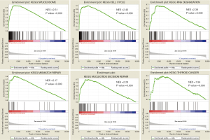 Previous evidence has proved that several HNRNP family members were involved in MAPK and AKT signaling pathway in hepatocellular carcinoma (12,13). A previous study found that HNRNPM could participate in Akt signaling pathways in Ewing sarcoma (8). The role of HNRNPM in MAPK and AKT signaling pathway in HCC needs to be further detected. Hence, we performed Western blot for verification. Downregulation of HNRNPM reduced the phosphorylation ratio of ERK and Akt in Hep3B cells (Figure 4E,4F), while knockdown HNRNPM in HepG2 cells altered the phosphorylation ratio of ERK and JNK (Figure 4G,4H). Together, our results indicated that HNRNPM might participate in several identical pathways in HCC and downregulation of HNRNPM could both alter the MAPK and AKT signaling pathway. Table S1 showed us the enriched KEGG gene sets with P value <0.05, FDR <0.1. GSEA analysis revealed that HNRNPM-high-expression group were enriched in KEGG SPLICEOSOME, KEGG CELL CYCLE, KEGG RNA DEGRADATION and KEGG PYRIMIDINE METABOLISM, with the NES (normalized enrichment score) and normalized P values shown in Figure 5.