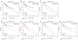 To clarify the biological role of HNRNPM in HCC, Kaplan-Meier analysis was employed and the findings illustrated that higher expressed HNRNPM was associated with shorter OS of HCC patients (Figure 1A). Cox regression multivariate analysis further indicated that HNRNPM was an independent prognostic factor for the OS of HCC, which was independent of TNM stage (Table 1). In male patients, the higher HNRNPM expressed, the poorer the prognosis. Whereas, it did affect survival time in female patients (Figure 1B,1C). We also analyzed the value of HNRNPM in HCC patients with different risk factors. With or without hepatitis virus, HNRNPM still affected the survival time (Figure 1D,1E). And with or without alcohol consumption, HNRNPM still affected the OS (Figure 1F,1G).