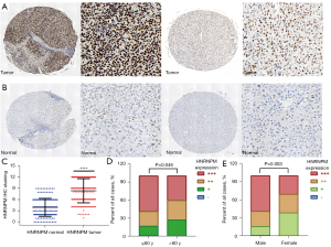 Xylene was used to deparaffinize the two tissue microarray sections. Then the sections were put into graded ethanol. Antigen retrieval, antibody incubation and other specific steps were reported in the previous manuscript (10). The sections were incubated with monoclonal mouse monoclonal mouse anti-HNRNPM (sc-20002, Santa, USA) at 1:1,000 dilution. Experiments were performed under a project license (No. 2018-226) granted by Animal Ethics Committee of the Second Affiliated Hospital of Xi’an Jiaotong University, in accordance with the Guide for the Care and Use of Laboratory Animals (Eighth Edition, 2011, National Research Council, Washington, DC, USA).