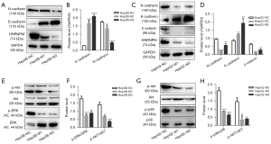 The CCK8 assay results demonstrated that Hep3B-shRNA-HNRNPM cells grew much slower than Hep3B-shRNA-NC cells. The proliferation rate of HepG2-shRNA-NC was obviously faster than that of HepG2-shRNA-HNRNPM (Figure 3A,3B). Migration assays showed that HNRNPM downregulation significantly impeded the migration of Hep3B and HepG2 cell lines (Figure 3C-3F). Western blot data revealed that knockdown of HNRNPM decreased the expression of the mesenchymal biomarkers of N-cadherin and β-catenin and increased the levels of Vimentin (Figure 4A-4D).