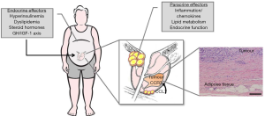 Despite the well-documented association between these diseases, the biological mechanisms linking obesity and aggressive prostate cancer remain unresolved. Based on the understanding of tumorigenesis in other solid cancers (7),and a limited number of mechanistic murine studies (6), it has been proposed that both systemic and/or adipose tissue-derived factors promote prostate cancer progression. Systemic promoters are produced as a consequence of obesity co-morbidities and include altered circulating lipids resulting from dyslipidemia, insulin resistance and mild hyperinsulinemia resulting from the development of pre-diabetes, and alterations in several endocrine cascades including the growth hormone/insulin-like growth factor-1 axis, renin-angiotensin system and steroid hormones (Figure 1). Dramatic changes in adipose tissue morphology and function occur in obesity (8), and altered lipid metabolism, secretion of adipose tissue derived proteins called “adipokines”, and the development of subclinical inflammation secondary to immune cell infiltration into adipose tissue have been postulated to drive cancer pathogenesis.