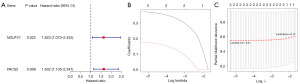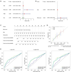 To investigate the prognosis of clinicopathological characteristics and risk scores, clinicopathological factors such as TMB, gender, age, and risk score were included in the risk model for univariate Cox independent prognosis analysis, and then factors with P<0.05 were subjected to multivariate Cox independent prognosis analysis. Next, an independent prognostic model for clinical factors was constructed using the cph function based on the independent prognostic factors screened by multivariate Cox independent prognosis, and a nomogram was drawn to visualize this predictive model. Furthermore, calibration curve, ROC curves, and concordance index (C-index) were applied to validate the validity of the nomogram.