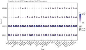 TMB was implied as a predictive marker in terms of cancer immunotherapy efficacy (12,13). MSI is a novel technique that can interrogate cancer biomarkers associated with tissue pathologies and investigate tumor aggressiveness (14). The correlation between the SOX family and TMB and MSI was further studied to reveal the significant role of the SOX family-related signature in PCa, revealing that the TMB scores reduced due to the overexpression of SOX5 (P=9.67e-07) and SOX30 (P=8.11e-15) (Figure S4A). Moreover, the TMB score increased as SOX8 (P=0.002), SOX11 (P=4.35e-4), and SOX12 (P=8.67e-9) were overexpressed (Figure S4A). In MSI analysis, the MSI score had a significant positive correlation to SOX8/11/12 expressions (P=0.001, 0.025, and 0.010, respectively) and a negative correlation to SOX5 expression (P=0.002) (Figure S4B). For developing a therapeutic target, one significant part is the analysis of its relation to existing drugs. Herein, drug sensitivity analysis indicated that downregulated SOX5/12/11 was correlated to drug resistance of CTRP, such as olaparib, axitinib, and tivantinib (Figure 7), demonstrating SOX5/12/11 as potential drug scanning targets. Moreover, the relation between SOX family expression and the pTNM stage was also analyzed, revealing that PCa patients with overexpressed SOX5 (Figure S5A), SOX11 (Figure S5B) and SOX30 (Figure S5C) had a low pT stage; with no significant relation between SOX8 (Figure S5D) and SOX12 expression (Figure S5E) and pTNM stage.
