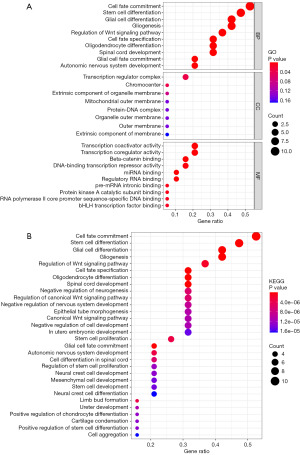 To clarify SOX family potential function further, GO and KEGG analyses were performed. GO analysis revealed that the SOX family was involved in cell fate commitment, stem cell differentiation, regulation of the Wnt signaling pathway, transcription regulator complex, transcription activity, miRNA binding, and regulatory RNA binding (Figure 8A). Based on the KEGG pathway analysis, the SOX family enrichment was in cell fate commitment, stem cell differentiation, regulation of the Wnt signaling pathway, stem cell proliferation, and cell aggregation (Figure 8B).