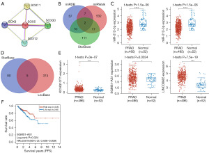 Further correlation analysis revealed a positive correlation between SOX2/5/6/7/13/15/30 expressions (Figure 9). Among these SOX family members in the signature, SOX5 was identified as the hub gene by a PPI network (Figure 10A), and we selected SOX5 for further analysis. Three miRNA prediction websites (miRDB, miRWalk, and StarBase) were used for predicting SOX5 miRNA targets, suggesting that miR-194-5p and miR-212-3p were potential targets (Figure 10B); however, expression analysis showed that in PCa, miR-194-5p was overexpressed, while miR-212-3p was downregulated (Figure 10C, all P<0.05), suggesting that SOX5 was downregulated in PCa tissues; considering miR-194-5p the most advantageous SOX5 miRNA target in PCa. The miR-194-5p lncRNA target was explored further using lncBase and StarBase, revealing that 5 lncRNAs (KCNQ1OT1, LINC00665, SGMS1-AS1, ZNRD1-AS1, COX10-AS1) were suggested as potential miR-194-5p targets (Figure 10D). Among these lncRNAs, lncRNA KCNQ1OT1, LINC00665, and SGMS1-AS1 were altered in gene expression in PCa compared with normal tissues (Figure 10E). However, the further prognostic analysis revealed that only SGMS1-AS1 had a correlation to the survival rate among the above 3 differentially expressed lncRNAs (Figure 10F, P=0.024). Consequently, the lncRNA SGMS1-AS1/miR-194-5p/SOX5 regulatory axis may be crucial in PCa progression. More research is needed, both in vivo and in vitro, for the purpose of validating this hypothesis.