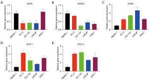 SOX5/30 expression was downregulated in most PCa cell lines compared to RWPE-1 (Figure 11A,11B). Moreover, SOX8/11/12 were overexpressed in all the PCa cell lines compared with RWPE-1 (Figure 11C,11D). These results were in accord with the expression of the SOX family in clinical tissues based on TCGA data.
