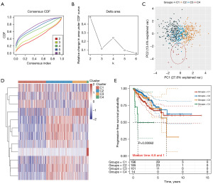 Consistency analysis was performed with the ConsensusClusterPlus R package. The maximum cluster number was 6, 80% of the total sample was drawn 100 times, clusterAlg = “hc”, and innerLinkage = “ward. D2”. By utilizing the R software package pheatmap (v1.0.12), heatmaps were clustered. The gene expression heatmap retains genes with SD >0.1. When the number of input genes exceeds 1,000, the top 25% of genes will be extracted after sorting the SD.