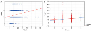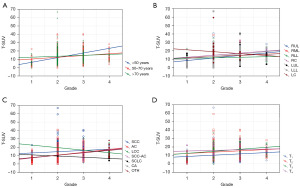 This correlation was significant in both: men (P<0.001) and women (P<0.001) (Figure 1B). Separate calculations were performed to determine whether this correlation was dependent on patients’ age. Significant correlations were found in all analyzed age groups: for individuals younger than 50 years, between 50 and 70 years, and older than 70 years (P=0.02, P<0.001 and P=0.03, respectively) (Figure 2A). Analysis according to the lobar location of the tumor showed a significant correlation between the SUV and grade for the right upper and left lower lobes, as well as for the central location in the right lung (P<0.001, P=0.005, and P=0.04, respectively). No correlation was found for the right middle, right lower, left upper lobes or central location in the left lung (P=0.32, P=0.41, P=0.08, and P=0.55, respectively) (Figure 2B). Analysis according to histological type showed a significant correlation between SUV and grade for squamous cell cancer and adenocarcinoma (P<0.001, and P=0.01, respectively), but not for any other type (P=0.11–0.41) (Figure 2C). Furthermore, upon conducting an analysis based on the T factor [in accordance with the 7th edition of the tumor-node-metastasis (TNM) system], a significant correlation between SUV and grade was observed for T1–T3 factors (P<0.001, P=0.006, P=0.005 respectively) (Figure 2D).