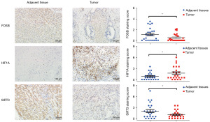 The embedded tissues were cut into 4 µm sections. Dewaxing and hydration were performed in xylene and fractionated ethanol. Endogenous peroxidase blocking solution was added dropwise to inhibit the endogenous peroxidase activity of the tissue, and then ethylenediaminetetraacetic acid (EDTA) repair solution (BL618A, Biosharp, Hefei, China) was used for antigen repair. After being blocked with normal serum solution, sections were incubated with antibodies of SIRT3 (s4072; Sigma-Aldrich, St. Louis, MO, USA), HIF1α [36169; Cell Signaling Technology (CST), Danvers, MA, USA], and FOSB (ab184938; Abcam, Cambridge, UK) overnight. Then, the goat anti-rabbit IgG secondary antibody (1:4,000–80,000, BL003A, Biosharp) coupled with horseradish peroxidase (HRP) was added. Finally, the slices were stained with diaminobenzidine (DAB) chromogenic solution (BL732A, Biosharp) and hematoxylin staining solution and dehydrated using fractionated ethanol and xylene. Finally, the slices were sealed with neutral gum and observed under a light microscope. The grading of staining intensity was as follows: absent staining =0, weak =1, moderate =2, and strong =3. The percentage of staining was graded as follows: 0 (no positive cells), 1 (<25% positive cells), 2 (25–50% positive cells), 3 (>50–75% positive cells), and 4 (>75% positive cells). The score for each tissue was calculated by multiplication; the range of this calculation was therefore 0 to 12.