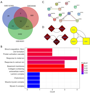 The datasets (GSE26566, GSE45001, GSE132305) were downloaded from the Gene Expression Omnibus (GEO) database (https://www.ncbi.nlm.nih.gov/) and samples were divided into two groups as per the type of tissue: CCA and adjacent tissues. The data were normalized using the limma package of RStudio (Posit; Boston, MA, USA) and differently expressed genes (DEGs) were obtained between CCA and adjacent tissues [|log fold change (FC)| >1, P value <0.05, and the base of |logFC| was 2]. Then, the Venn diagram template from Bioinformatics & Evolutionary Genomics (http://bioinformatics.psb.ugent.be/webtools/Venn/) was used to obtain the intersection graph of the different groups of DEGs.