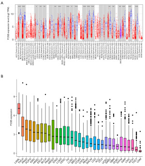 We performed further expression analysis on the screened key genes. Firstly, the pan-cancer analysis of FOSB was carried out by using the pan-cancer analysis module of TIMER2.0 (Figure 2A) to observe the overall differential expression in malignant tissues and normal tissues. Moreover, Rstudio ranked its expression levels in these tumors (Figure 2B). The results revealed that the expression levels of FOSB were downregulated in CCA and most malignant tumors.