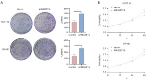 For colony formation assay, briefly, 4,000 colon cancer cells with over-expressed or under-expressed ARHGEF16 were seeded into a 6-well plate. And cells were maintained until colonies formed. Colonies were then fixed by paraformaldehyde for 30 min and stained using crystal violet. The colonies were then taken a picture and calculated (×2).