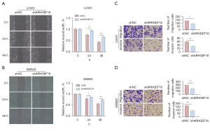 To further assess the effect of ARHGEF16 on the migration and invasion ability of colon cancer cells, we performed scratch assays and Transwell assays on cell lines with overexpression and silence of ARHGEF16. The results showed that in LOVO and SW620 cell lines silenced with ARHGEF16, the scratch assay showed that the scratch healing rate of cells in the shARHGEF16 group was significantly slower compared to the shNC group (Figure 5A,5B, P<0.05). The Transwell assay similarly corroborated the results of the scratch assay. Compared to the shNC group, the shARHGEF16 group had a reduced number of penetrating cells and a significantly lower migration rate, and we also found that the invasive ability of the cells was significantly reduced after silencing of ARHGEF16 (Figure 5C,5D, P<0.05).