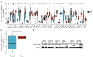 We analysed the expression levels of ARHGEF16 in different tumour tissues and normal or paraneoplastic tissues using the TCGA database. The results showed that ARHGEF16 was highly expressed in a variety of tumours compared to normal tissues (Figure 1A). The difference was more pronounced in colon cancer tissues (P<0.001) (Figure 1B). We then further collected clinical fresh tissue specimens from six patients for testing. The results revealed differences in the expression of ARHGEF16 in cancer and paraneoplastic tissues (Figure 1C).