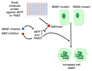 Taken together, Smith and colleagues identify a clinically relevant combinatorial therapy through drug repositioning that could improve initial response to targeted MAPKi therapy. MITF repression has been linked to increased cell invasion and metastasis (16). Thus, there needs to be further studies to fully examine the nelfinavir and MAPKi combination. Nonetheless, this study is an important step in discovering new personalizable combinatorial treatments that could improve response to targeted therapies and perhaps even immunotherapies.