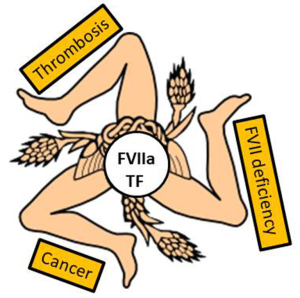 The activation of factor VII (FVII) represents a key step for the initiation of blood coagulation, amplified by the activation of several serine proteases in the cascade (1). The physiological activity of activated FVII (FVIIa), and thus blood clotting, is triggered when plasma comes into contact with wound-exposed tissue factor (TF) thus forming the TF-FVIIa complex (2), which requires phospholipid membranes because TF is an integral membrane glycoprotein and FVIIa binds to membrane surfaces via its vitamin K-dependent domain (3,4). The TF-FVIIa pathway, defined as the “prima ballerina” of the whole coagulation process (5), includes the activation of factor IX (FIX) and factor X (FX) by limited proteolysis, ultimately leading to fibrin deposition and clot formation. Alterations of the TF-FVIIa pathway, increasing or decreasing its function, play multiple roles in human diseases (Figure 1).
