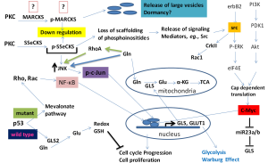 Thus, it appears that reprogramming of glutamine metabolism and elevated glutaminase activity meet the metabolic demands for increased biomass and lipid synthesis required to replace the plasma membranes lost from these cancer cells as extraverted vesicles. In this respect, it is intriguing that, in a recent study, exosomes from bone marrow mesenchymal cells were shown to contain a microRNA (miR23b) directed against MARCKS mRNA that promotes dormancy in metastatic breast cancer cells (32). Apparently, breast cancer cells fuse with vesicles containing miR23b, inducing suppression of the gene MARCKS. This observation has at least three important implications. First, the miR23b when taken up by the target cancer cells may also down-regulate the expression of GLS, thus preventing the reprogramming of glutamine metabolism, which is crucially needed for cell proliferation and increased metabolic demands. Second, suppressing glutamine metabolism (in the absence of the c-Myc signal) may promote cancer cell dormancy, such as in micrometastases. An increase in GLS may then function as a “wake up” signal for dormant cancer cells to emerge as a proliferating cancer cell. Third, the observation that miR23b also targets MARCKS protein along with GLS strongly supports the hypothesis (Figure 1) that MARCKS/SSeCKS integrates in the Rho GTPases/GLS regulatory mechanism.
