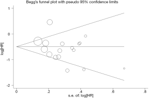 Begg’s funnel plot and Egger’s test were performed to assess the publication bias in the literature. All 17 eligible studies investigating NSCLC patients yielded a Begg’s test score of P=0.154 and an Egger’s test score of P=0.126, meanwhile according to the contour-enhanced funnel plot (Figure 4), the absence of publication bias was found in all 17 studies. These results suggest that there is no publication bias at work.